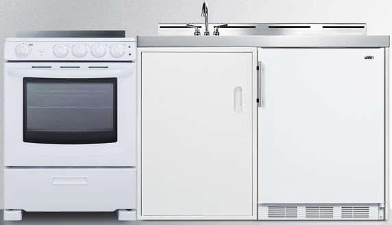 Summit's line of all-in-one combination kitchenettes brings complete kitchen convenience in a slim-fitting design. These units come fully featured with everything you need for the home foodservice experience, including a refrigerator with a freezer compartment, 4-burner smooth top range with oven, sink with faucet, cutlery bin with a removable cutting board cover, and storage cabinet for dry goods.Read More